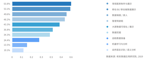 《白皮书》指出国内企业对于对于BI功比较看重报表能力、移动端、填报录入、管理驾驶舱这几项。对于机器学习、自然语言识别、人工智能这些未来 BI 的功能,企业并不感冒,仅有一成的企业表示关注。这些功能更多地是停留在概念层面,目前仍处于炒作期,实际的使用场景还不多。