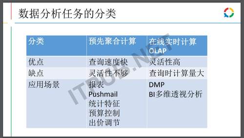 数据分析的任务有两种类型,一种先把数据聚合好直接查询,但这种查询需要预先指定分析数据的维度和量级等等,一旦有新的需求的需要进行重新的开发、验证、上线、部署。如果查询历史数据需要重跑各种历史数据。适用于各种报表或线上统计数据。而另外一种方式是实时查询计算,这种方式计算量会非常的大,但灵活性很高,可以任意地执行OLAP场景的分析,这种方式需要预先把数据准备好,指定合适查询的格式做相应的分析,适用于DMP和BI场景。