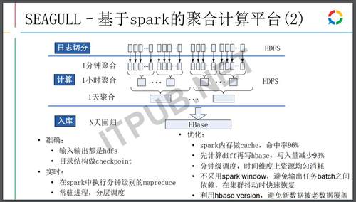 聚合计算平台先将切分好的数据放到HDFS上,通过在Spark上调度很小聚合任务的方式去做相应的调度。通过这种方式,首先的话输入和输出都是HDFS,启动后只用看输出不存在输入存在,则做一下相应的逻辑。这样避免了Spark checkpoint带来的各种问题。相当于在Spark里面去执行一些比较小mapreduce的项目,如何避免刚才说的那个问题,首先spark worker是常驻的进程,不会有JDM的启动和停止的开销,分层调度只用把spark提起来,然后spark在driver里面启动,所以调度能够非常快。使用spark会带来一个麻烦,它是常驻进程,内存泄露就是一个很严重的问题,搞定这个问题后可以有内存来做很多的cache,从而加快计算速度。由此形成了一个统一的基于Spark streaming聚合计算平台,把最终数据输出到HBase,通过SQL的查询的接口获取相应的数据。