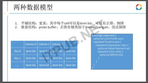 计划引擎分为两种数据结构,一种是二维表的独立的数据结构,这种数据结构的特点是正排能够用列存储的方式来存,可以对数据去建相应的倒排数据,然后另外是嵌套结构,像Jason和proto buffer,用的比较多的是proto buffer,在广告的线上业务打印出来的日志为了做比较好的兼容,原始的数据都是proto buffer格式,需要保证原始的数据供大家去排查、分析各种问题,所以需要把这种嵌套的结构以一个比较高效的方式存储下来,使得上面的OLAP分析比较迅速。