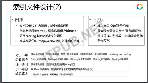 正排的话,首先是列存储,把相似的数据放到一起采用非常高效的编码,去优化储存的量级。针对业务的数据,构建了十多种编码方案,通过自适应去采用相应的编码方案。