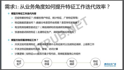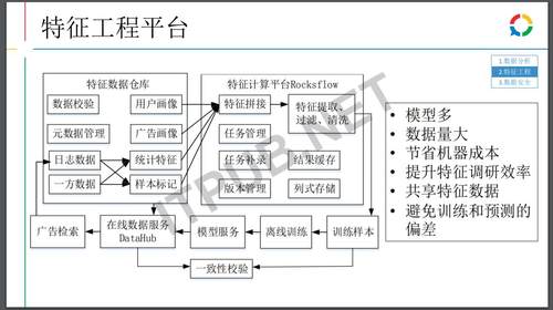 首先建立模型,比如说做一个商品推荐模型,首先需要用户的册子提取原始数据,包括广告数据、用户行为数据构造的样本,之后进行数据拼接,最后调用相关的数据进行模型的训练,之后再离线做TDC,完成一并将特征推到线上,整个过程中数据维护是很大的开销。另外一点是当不同模型有不同数据流之后,多个模型之间所产生的特征不同,而导入特征测试新的模型会很麻烦,所有的流程需要重新走一遍,最后测试的结果也不一定好,这就需要解决到底是实践过程有bug,还是说这个东西对模型没有用。