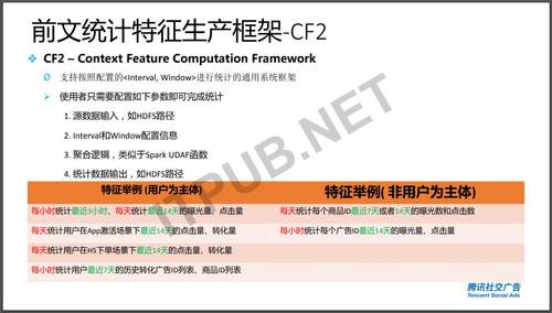 下面讲特征具体包括的东西,比如前文特征,前文特征指的是用户过去的一些行为,而且是实时需要产生到线上的进行相应的处理,腾讯现阶段是分钟量级的更新,如果来了一条数据就去计算,腾讯有10亿量级的用户,每个用户跑一个全量的计算,这个是非常不现实的,实际做法是利用HBASE的Qualifier family特性将数据分开来,当用户有数据有变更的时候,把它存在单独的Qualifier family做区隔,来触发规定时间内的数据扫描和相应抽取解析,通过这种方式在一个比较可接受的机器量级上,完成前文特征的统计框架。