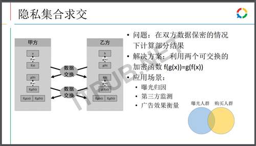 举个例子如何衡量广告的效果,广告主方有广告带来的购买行为数据,而我们有广告的点击或曝光等数据,想要衡量效果的话很简单,要么我们把数据给广告主去做对应归因匹配,要么广告主把数据给我们去做对应归因匹配。如果这两条路子都走不通,有一种方式叫隐私集合求交,用两个加密的可交换函数,将双方的数据经过多次的加密处理后,去计算它们的交值,出来的结果就可以衡量广告效果。