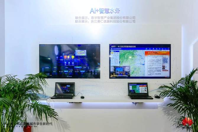在AI+水务展岛,针对我国一些城市“逢雨必涝”这一重大问题,华为与生态伙伴联合推出了智慧水务防汛联合解决方案,全面提升了防汛排涝水平。