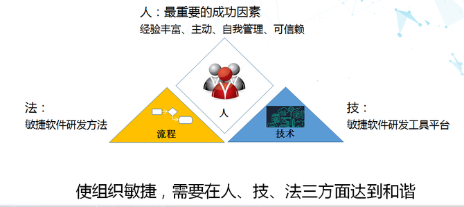 在做敏捷转型的时候,第一个是流程,第二个是人,第三个是技法。这三个方面人是最重要的,经验是否丰富,主观能动性、自我管理意识是不是一个可信赖的合作伙伴,这是很重要的。