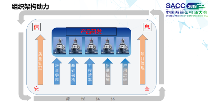 最外面是流程优化,真正的跟着所有的研发过程去看,到底哪个问题是会阻碍或者是带来风险的,然后去分析来优化流程做一些业务流程的闭环,使得我们下次迭代时可以更高效、更高质的去做,这些就是组织架构的助力。