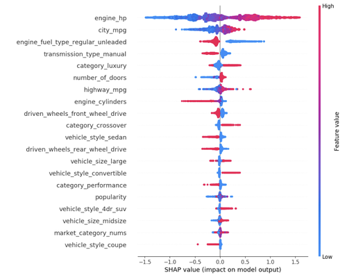 (注:SHAP值表征了每个特征对模型输出的影响,如图中,较小的engine_hp“引擎马力”值会降低汽车的预测价格)