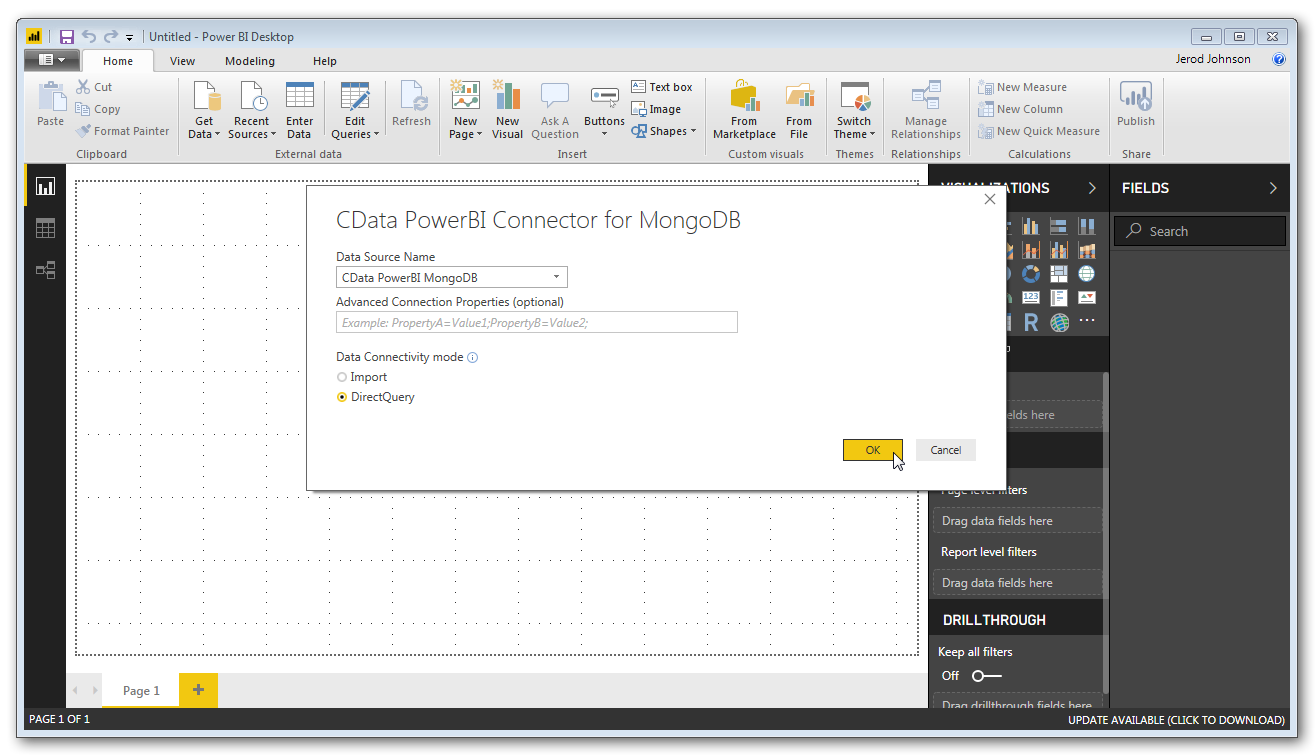 配置连接和架构文件后, 您可以在 Power BI 中查看实时 MongoDB 数据。由于 CData 连接器是使用自定义连接器接口构建的, 因此您必须选择将 MongoDB 数据拉入内存 (导入) 或连接 live (DirectQuery)。