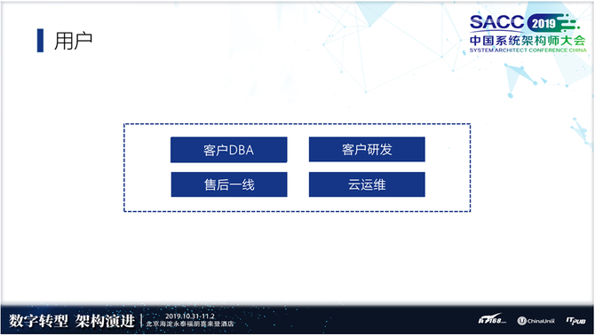谁是用户?做一个数据系统,DBA就是我们的用户吗?实际上不止,我们认为一个系统的用户有很多,DBA是主要使用的人,研发和到服务端的售后一线也是这个系统的用户,还有云自己的运维工程师也是用户。
