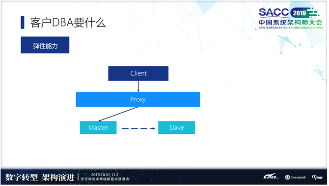 我们看一下没有扩展能力系统是什么样。不是完全没有扩展能力,最开始是支持简单的业务,一主一从的数据库,中间Proxy是为了客户切换时方便一点。很多数据库创建连接时成本很高,有了Proxy做连接保持,连接成本会低一点。扩容怎么做,登陆服务器执行各种工具和脚本,速度很慢。