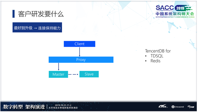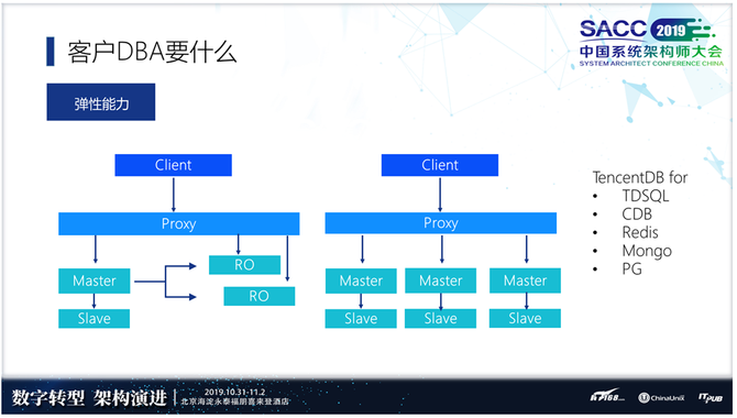 这个架构只是说满足预期,像数据库、CDB、TDSQL、Mongo、PG都支持小时级别的扩容。差别是CDB没有Proxy这一层,但是没有关系,比如左边读写,没有Proxy我们就可以用域名或者VIP,当然了像左边这种架构如果没有Proxy的话,你会拿到两个IP,一个主实例IP还有一个所有读节点读群IP,这是满足预期的操作。