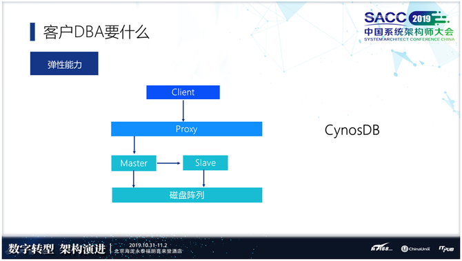 客户DBA要什么?第一个是学习东西不要太多,第二个是解决弹性扩容好一点,不要天天救火。第三个是解决问题的速度要快。客户DBA是最累的一群人,他们夹在中间 —上面有业务压力,下面的服务支持如果不给力,就很难受。