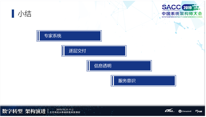 最后做一个小结。从下往上,首先是不管做什么,我们都要有服务意识。做云服务的,服务意识是基础能力,而且要知道服务的是谁。我们刚才说,这一套系统做出来服务好多层,客户DBA是我们的客户,一线、前端、开发是我们的客户。把信息透明出去逐层交付,DBA做专家系统让一线能力更强,一线让业务的DBA更强。再往上就是专家系统。