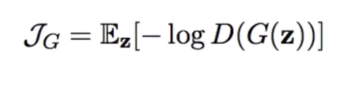 您可以在这里看到一个常数,其中方程式是指鉴别器将真实示例识别为真实示例,因为生成器与过程中的这一部分没有直接关系。但是人们发现,如果像上面的方程式那样使用生成器的损失函数,损失就会饱和。因此,我们要做的就是稍微改变一下公式(公式3)。