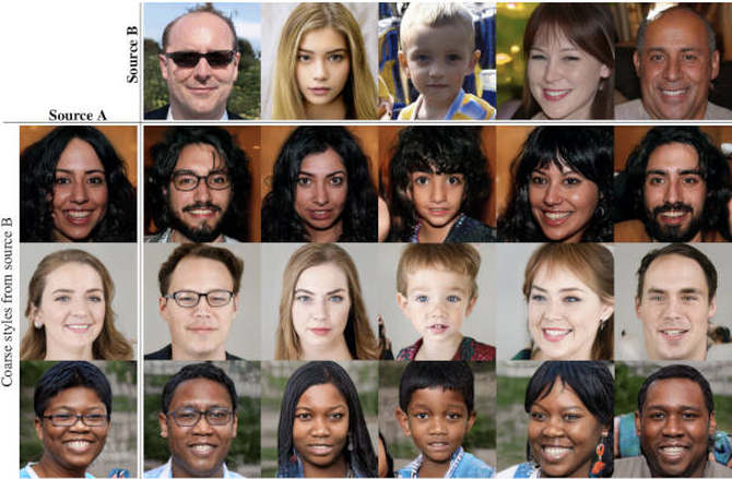 在这个特定示例中,我们看到的是采用源A的样式并将其应用于源B的结构。在左上角,我们将眼镜应用于不同的图像,或者让左边的人们看起来像小孩子。