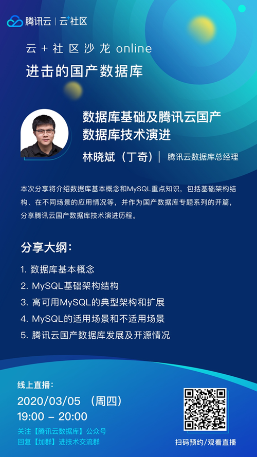 这不,好消息来啦!2020年3月5日19:00-20:00,腾讯云数据库总经理林晓斌(网名丁奇),将以《数据库基础及腾讯云国产数据库技术演进》为主题,为您在线分享数据库技术干货!值得一提的是,林晓斌不仅是数据库领域资深技术专家,也是MySQL社区贡献者,在数据存储系统、MySQL源码研究和改进、MySQL性能优化和功能改进,尤其在解决MySQL疑难问题方面,有着深入研究。