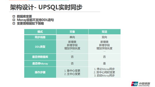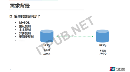 从2012年开始,中国银联在技术上确定了比较重要的方向:去IOE和多活建设。在这之前中国银联的传统业务数据都部署在DB2上,由2012年起,逐渐迁移到开源数据库或者国产数据库之上,如图【1】中的UPSQL就是中国银联在MySQL上的定制数据库版本(相信大家都可以通过“UP”联想到)。同时,目前银联在上海、北京各有一个信息中心,银联也正有计划地将业务系统进行多活改造。传统的金融企业去做国产数据库或者是自研开源数据库的原因无非三点:第一个是前段时间去IOE的“风气”,这里面包含政策激励和技术导向,金融行业或多或少地会去开始接触这类工作,同样也是得益于去IOE之风,我们的国产数据库和开源数据库才能蓬勃发展;第二个是商业数据库维护的成本问题;第三个是商业数据库有时的确无法负载实际的业务发展规模,以银联云闪付为例,在有优惠或者是折扣之类的活动时,系统处理业务时会存在热点账户,在做大促活动的实践中,银联已经发现DB2的热点更新是存在问题的,可以察觉到明显的时延(热点账户更新问题也是我们今年的一个主要的工作)。在以上的背景下,我们发现这些工作从开发到运维,每一步都充满了挑战,这里主要分享一下银联在数据同步上做的工作。