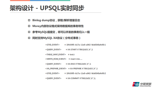 对Moray来说,同步UPSQL数据就是通过binlog dump的协议,把自己伪装成一个从库,获取日志来进行解析处理。Moray设计的内部协议格式保证了数据库回放的数据的事务特性,同时为了配合UPDRDB,也支持XA协议以完成分布式事务的同步。